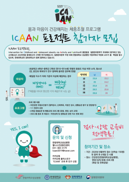 ICAAN 프로젝트 질병관리본부가 주관하고 한림대학교 성심병원 박경희 교수가 연구책임자로 연세대학교, 경희대학교와 함께 추진하는 소아청소년 고도비만 중재 연구 초등 4학년~중학교 2학년 연령 중 중등도 이상 비만 아동·청소년은 누구나 참여 가능하며 보다 자세한 프로그램 문의와 신청은 한림대 학교 성심병원 웰니스건강증진센터로 전화 신청 하면 된다.