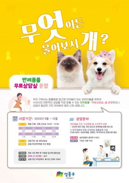 [무한뉴스] 서울 성동구는 전국 최초로 수의사의 전문적인 상담을 무료로 받을 수 있는 반려동물 무료상담실 ‘무엇이든 물어보시개’를 시범운영한다.