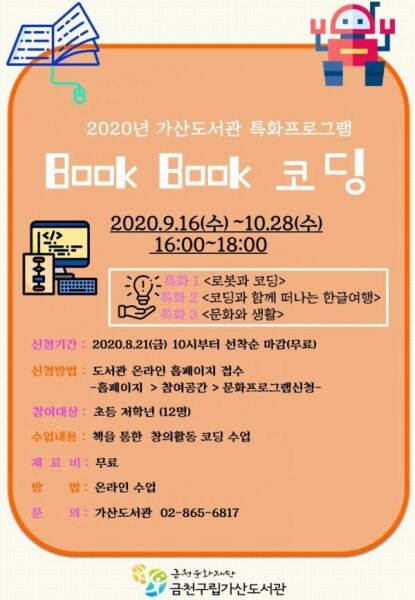 [무한뉴스] 금천문화재단은 금천구립가산도서관에서 2020년 특화프로그램으로 코딩을 주제로 한 ‘Book Book 코딩’을 9월 16일부터 10월 26일까지 진행한다고 밝혔다.