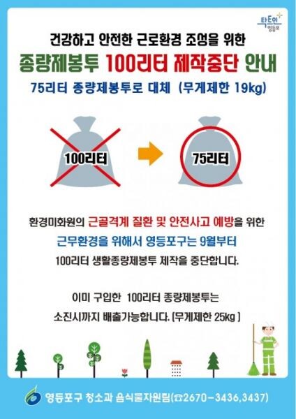 채현일 영등포구청장은 “100리터 종량제 봉투 제작 중단은 환경미화원의 안전을 위한 불가피한 결정”이라며 “75리터 종량제 봉투 제작이 폐기물 배출 감량과 환경미화원의 근무여건 개선에 큰 도움 될 것으로 기대한다”고 밝혔다.