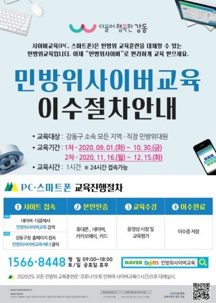 교육대상자는 강동구청 홈페이지 또는 인터넷 포털사이트에서 ‘민방위 사이버교육’으로 검색해 해당 교육사이트에 접속한 뒤 본인인증을 거쳐 교육을 받으면 된다.