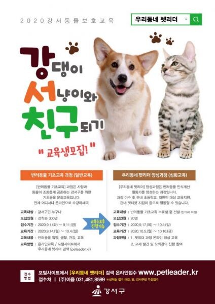 희망하는 구민은 강서동물보호교육 홈페이지나 포털 사이트에서 ‘우리동네 펫리더’라고 검색해 접속한 후 신청하면 된다.