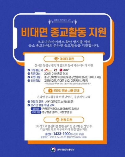 온라인 종교활동은 코로나19 전염 및 확산 우려가 있는 대면 집회 및 모임을 온라인 채널, 모바일 앱 등을 통해 대체 운영하는 것으로 해당 사업은 200인 이하 종교단체를 대상으로 온라인, 모바일 플랫폼을 활용한 영상 송출 방법을 안내하고 종교 단체별 1회선에 한해 2개월간 영상 전송에 필요한 데이터를 지원한다.