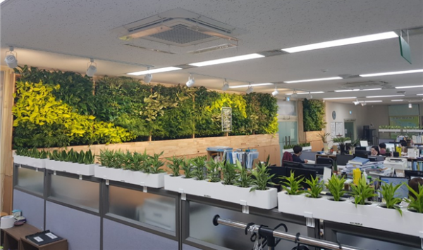 ‘그린힐링오피스’는 공기정화식물을 활용해 바이오월, 파티션 화분을 설치한 것을 말하며 실내 공기오염물질 농도를 낮춰 실내 공기질을 개선하는 효과가 있다.