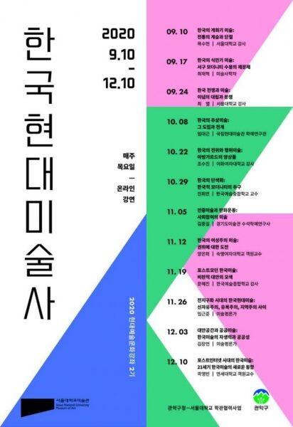 이번 강의는 한국의 개화기 미술부터 전쟁, 포스트모던, 포스트인터넷 시대 등 한국 현대 미술을 총망라하는 12개 강좌로 구성되어 9월 10일부터 매주 목요일 온라인으로 실시된다.