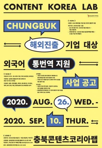 [무한뉴스] 충청북도와 청주시가 주관하고 청주시문화산업진흥재단이 운영하는 ‘충북콘텐츠코리아랩’이 오는 다음달 10일까지 ‘해외진출 기업 대상 외국어 통·번역 지원 사업’ 참여기업을 모집한다.