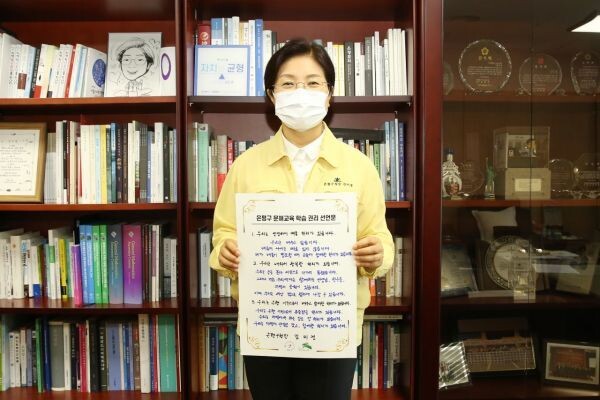 [무한뉴스] 김미경 은평구청장은 2020년 은평 문해 한마당 “한평생 좋은날, 온라인 이야기” 개최에 앞서 ‘은평구 문해교육 학습권리 선언문’ 손글씨 쓰기에 동참했다.