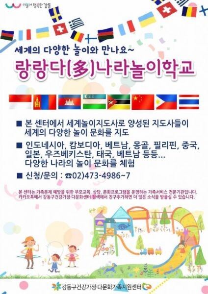 이정훈 강동구청장은 “이번 세계놀이 활동을 통해 우리와 다른 나라의 문화를 체험하고 공감하는 계기가 되길 바란다”며 “앞으로 구는 강동구건강가정·다문화가족지원센터와 함께 다문화 인식 개선을 위한 다양한 프로그램을 마련해가겠다”고 밝혔다.