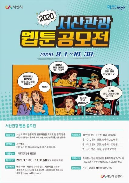 공모분야는 서산9경과 같은 볼거리, 먹거리, 축제, 농·특산품 등이며 서산의 다양한 관광자원을 테마로 한 여행 경험을 창작 웹툰으로 표현하면 된다.