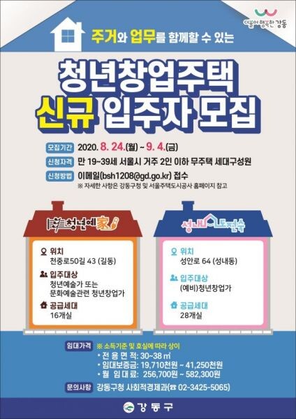 [무한뉴스] 강동구가 오는 9월 4일까지 청년예술인과 청년창업가를 대상으로 주거와 업무를 함께할 수 있는 신규 청년창업주택 2개소에 입주할 청년을 모집한다.