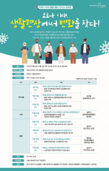 [무한뉴스] 서울시동북권NPO지원센터는 오는 9월 2일부터 “코로나 시대, 생활현장에서 변화를 찾다”라는 주제로 7회에 걸쳐 온라인 공론장을 운영한다.