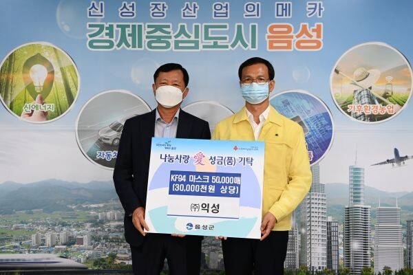 [무한뉴스] 음성군 삼성면 소재 국내 자동차용 내장소재 및 건축용 흡음, 차음, 제진 등의 첨단 기술을 개발하는 익성에서 31일 음성군청을 방문해 최근 재확산되고 있는 코로나19의 지역사회 전파를 막기 위해 써달라며 KF94 마스크 5만매를 기탁했다.