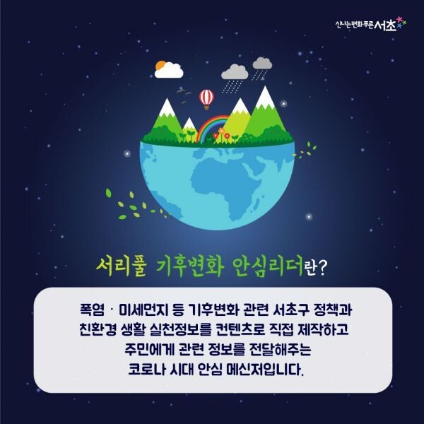 [무한뉴스] 서울 서초구는 폭염 · 미세먼지 등 급변하는 기후변화에 있어 구 정책과 친환경 생활 실천정보를 직접 제작해 주민에게 정보를 전달해주는 ‘서리풀 기후변화 안심리더’를 모집한다.