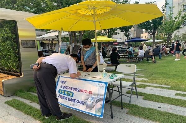 구는 GTX-D의 유치를 위해 3월부터 구 소식지, 홈페이지, SNS 등으로 QR코드를 이용한 쉽고 빠른 온라인 서명운동과 구청 청사와 전 동주민센터, 지하철역 등 주요 거점에서는 오프라인 서명운동을 지속 추진해왔다.