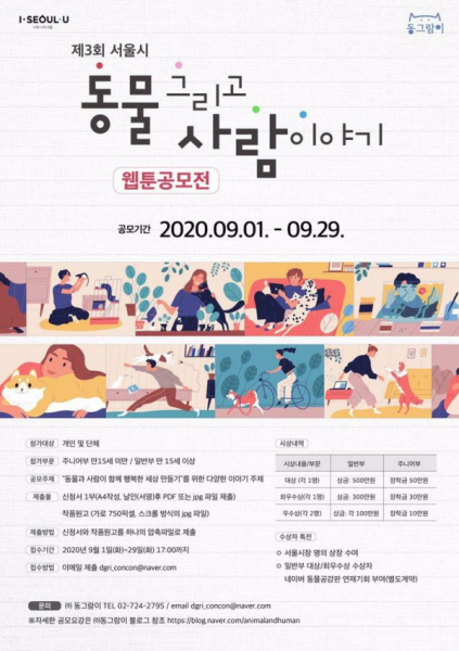 [무한뉴스] 서울시는 네이버 ‘동물공감’판 운영자 ㈜동그람이와 함께 제3회 서울시 ‘동물 그리고 사람이야기’ 웹툰 공모전을 9월 1일부터 29일까지 한 달 동안 개최한다.