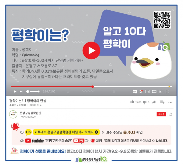‘알고10다 평.학.이.’는 ‘은평구평생학습관 온라인 공감한데이’의 줄임말로 대중에게 평생학습을 친근하게 전달하기 위해 고안한 조류 캐릭터인 ‘평학이’가 학습관에 얽힌 이야기를 영상으로 소개하고 온라인 이벤트를 통해 축제 참여 기회를 제공하는 비대면 행사이다.