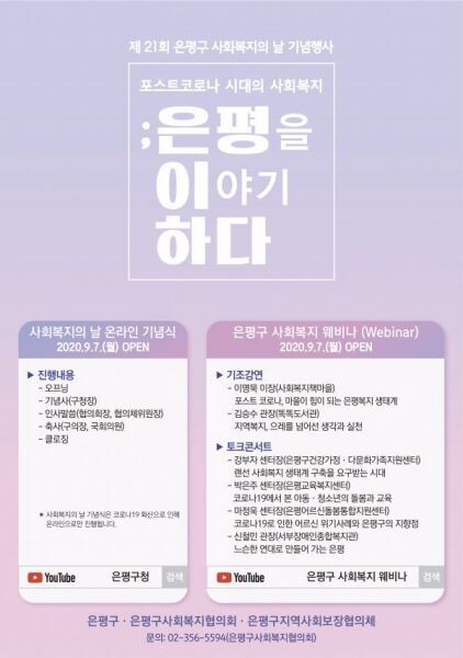 구 관계자는 “제21회 사회복지의 날을 맞아, 몸은 떨어져 있지만 같은 시간 같은 마음으로 온라인을 통해 사회복지의 날을 함께 기념하는 소중한 시간이 되시기를 바란다”며 “9월 7일 은평구청 유튜브 채널을 통해 은평구민과 사회복지 관계자의 많은 시청을 부탁드린다”고 말했다.