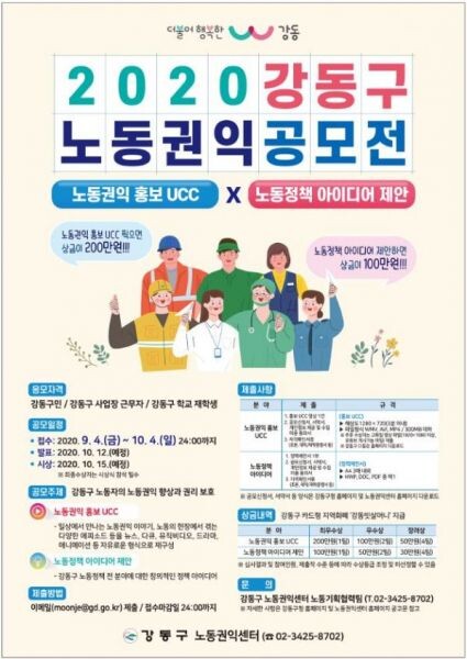 신종 코로나바이러스 감염증으로 사회적 거리두기가 지속되는 상황에서 주민의 안전을 최우선하기 위해 지난 5월 개최 예정이었던 ‘노동절 기념행사’를 비대면 행사로 전환하기로 하고 주민과 관내 노동자 등이 온라인으로 구정에 참여할 수 있도록 ‘2020 강동구 노동권익 공모전’을 마련했다.