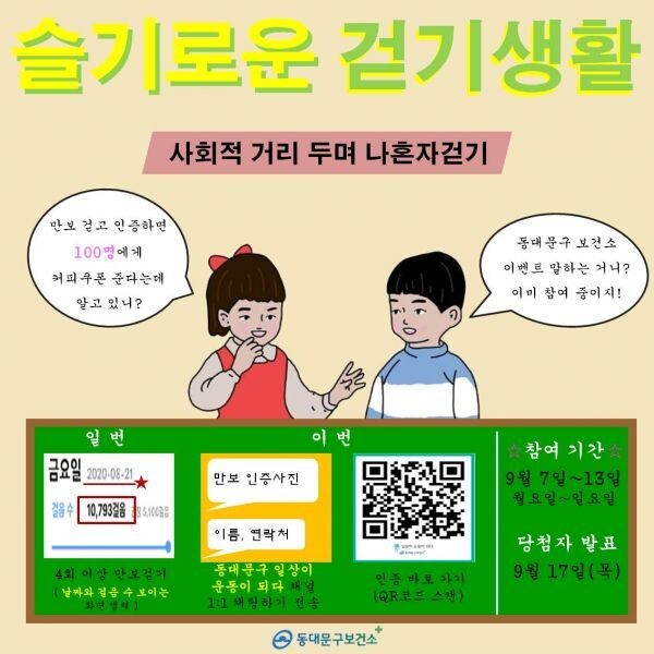 9월 걷기 챌린지는 7일~13일 일주일동안 4회 이상 만보를 걷고 걸음 수와 날짜가 보이는 화면을 캡쳐해 카카오톡 채널 ‘동대문구 일상이 운동이 되다’ 의 채팅하기로 전송해 인증하는 방식으로 진행된다.