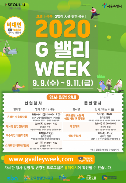 해외 바이어가 참여하는 수출상담회, 국내 벤처 투자자 80개사가 참여하는 데모데이, 50개 기업이 참여하는 채용박람회 등 G밸리 입주기업을 위한 산업행사가 3일간 온라인 방식으로 진행된다.