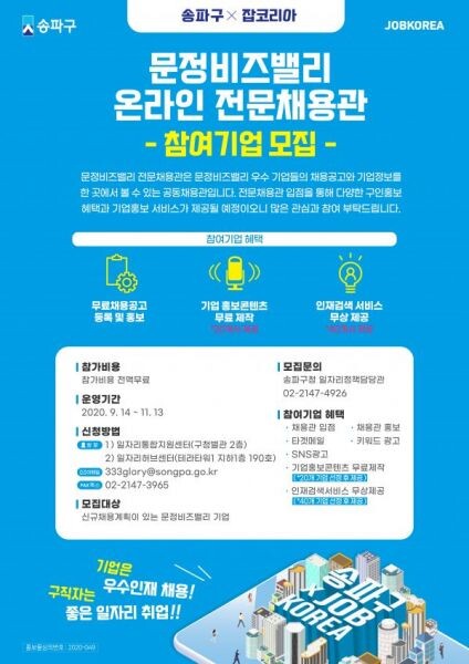 [무한뉴스] 송파구는 코로나19로 인력채용에 어려움을 겪는 중소기업과 청년 구직자들을 돕기 위해 오는 14일부터 잡코리아에 ‘문정비즈밸리 전문채용관’을 2차로 운영한다고 3일 밝혔다.