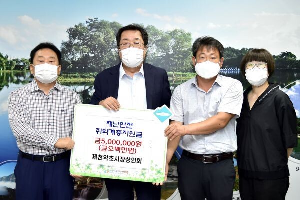 [무한뉴스] 한방도시 제천의 대표시장인 제천약초시장 상인회에서는 지난 2일 제천시청을 방문해 이번 집중호우로 피해를 입은 주민들을 위한 재난안전 취약계층 지원금 500만원을 기탁했다.