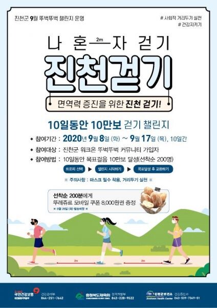 [무한뉴스] 진천군이 비대면 건강생활실천 사업인 ‘뚜벅뚜벅 모바일 걷기 앱’ 챌린지를 지난 8월에 이어 9월에도 운영한다.
