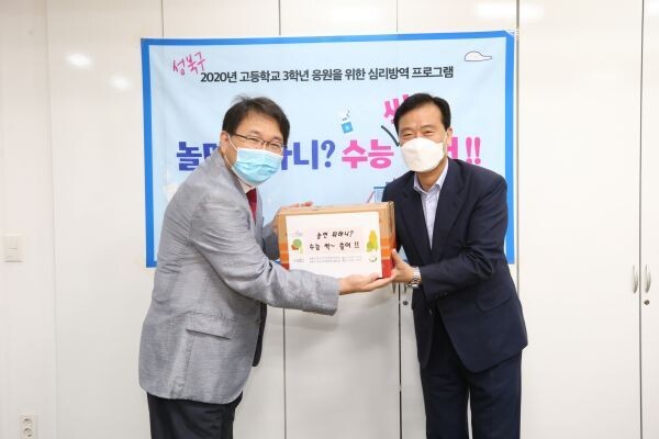[무한뉴스] 성북구가 지난 2일 코로나 19 확산 장기화로 인한 어려움 속에서 학업을 지속하며 큰 혼란과 불안을 겪고 있을 고등학교 3학년 학생들에게 ‘코로나 극복 심리방역 키트’를 전달하는 시간을 가졌다.