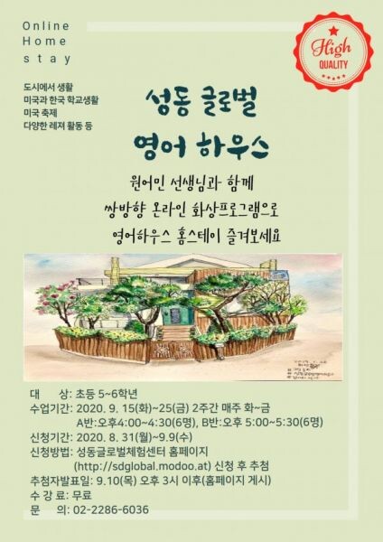 [무한뉴스] 서울 성동구 성동글로벌영어하우스는 오는 7일부터 9월 25일까지 성동구 지역 초등5∼6학년을 대상으로 ‘온라인 데이트립’ 및 ‘온라인 미니 홈스테이’를 운영한다고 밝혔다.