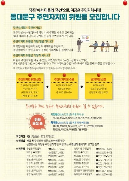 위원 모집기간은 10월 23일까지며 만 19세 이상 동대문구 주민이며 누구나 지원 가능하다.