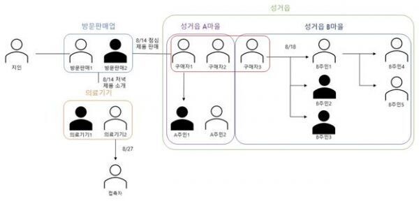 B·C마을 주민 3명 이외 2명은 건강식품, 의료기기 판매업자로 제품 소개를 위해 A사업장에 지난달 14일 방문해 1시간 이상 체류한 뒤 확진 판정을 받았다.