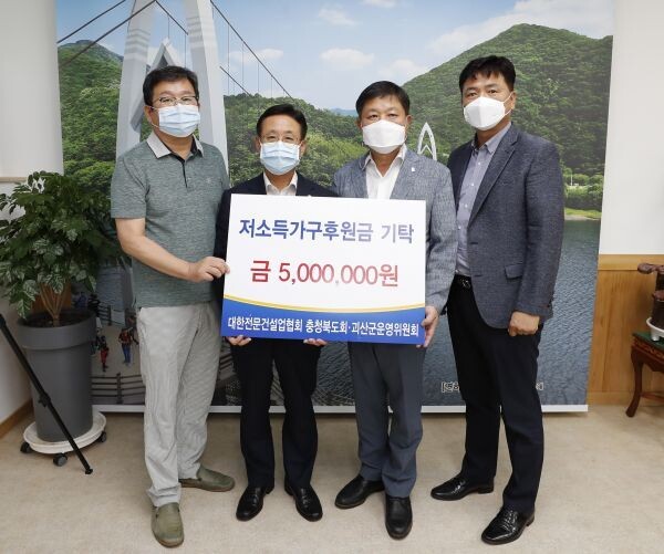 이날 기탁식에는 이차영 괴산군수, 우종찬 대한전문건설협회 충청북도회장, 송석규 대한전문건설협회 괴산군지회장 등 5명이 참석했다.