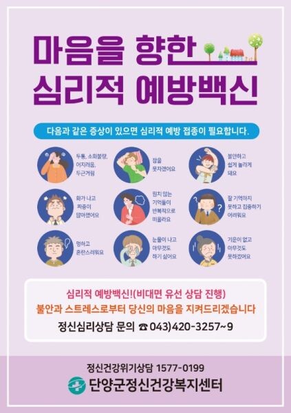 [무한뉴스] 단양군보건소는 최근 코로나19 감염 확산에 따른 사회적 거리두기 2단계 시행 등으로 군민의 심리적 피로도가 더욱 증가함에 따라 마음 안정을 위한 심리적 예방백신을 홍보하고 나섰다.