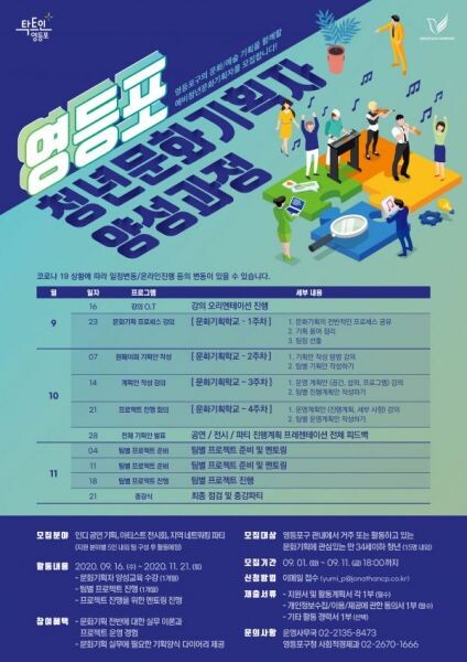 채현일 영등포구청장은 “문화·예술 분야에 관심 있는 예비 청년 문화기획자들이 이론 교육과 실습을 통해 꿈을 이뤄나가는 데 많은 도움이 될 것”이라며 “청년들이 코로나19 위기 속에서도 밝은 미래를 설계해 나갈 수 있도록 다양한 청년정책과 지원을 아끼지 않겠다”고 전했다.