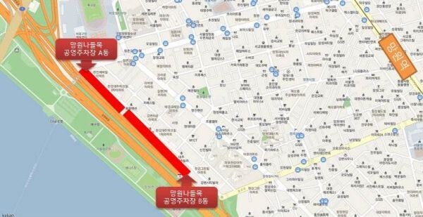 망원동 460-5번지 일대에 준공된 망원나들목 공영주차장은 A동 62면, B동 141면 등 총 203면의 주차면수를 갖추고 있다.