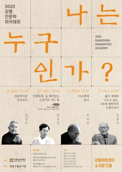‘나는 누구인가’는 우리 시대 저명한 철학자, 소설가, 작가를 초청해 주제별 강의를 듣는 인문학 특강으로 9월 16일부터 11월 4일까지 4회에 걸쳐 강동아트센터에서 진행된다.