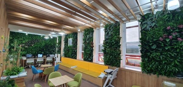 스마트 가든은 휴게 공간 벽면을 활용해 테이블야자, 스노우 사파이어 등 공기정화 효과가 크고 관리가 쉬운 식물을 중심으로 구성되어 있다.