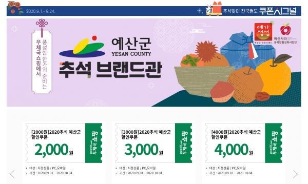 [무한뉴스] 예산군은 관내에서 생산된 농·특산물을 할인 가격으로 구매할 수 있는 추석맞이 우체국 쇼핑몰 특별기획전을 개최한다고 8일 밝혔다.