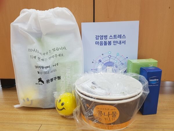 장기화되고 있는 코로나19 사태로 인해 스트레스와 심적 불안감, 우울감 등을 호소하고 있는 자가격리자에게 마음돌봄안내서 스트레스볼, 콩나물기르기 세트, 스트레칭 밴드 등을 제공하고 있다.