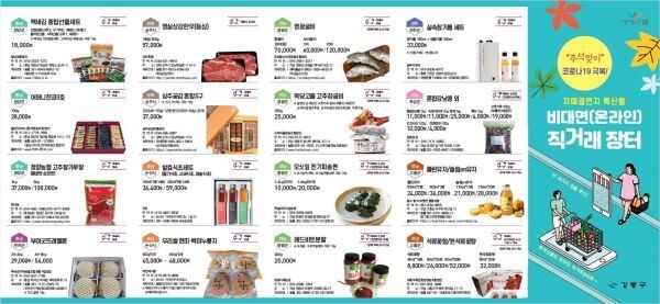 이번 온라인 직거래장터에는 강원도 홍천군 충청도 논산시, 음성군, 부여군, 청양군, 전라도 진안군, 영광군, 곡성군, 고흥군, 완도군 경상도 경산시, 상주시, 진천군, 봉화군, 영양군, 거창군 등 강동구와 자매결연을 맺은 전국 16개 시군이 참여한다.