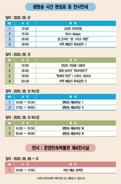 이어 둘째날은 오후 1시 무용협회의 '2020 가을춤 나들이' 공연 오후 4시 연극협회의 '바보이야기' 광대 놀이극 오후 7시 음악협회의 '힘내라 아산, I LOVE ASAN' 공연 오후 8시30분 지역예술인 축하공연 등을 끝으로 막을 내린다.
