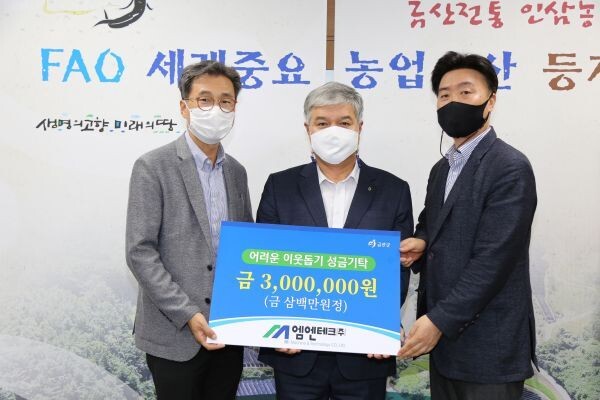 [무한뉴스] 엠엔테크는 지난 7일 금산군청을 방문해 어려운 이웃 성금 300만원을 기탁했다.