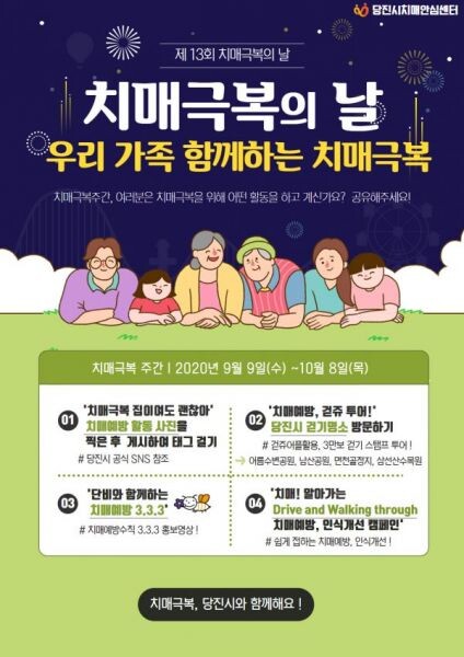 ‘치매극복 집이여도 괜찮아’SNS참여 치매예방 릴레이 ‘치매예방, 당진시 걷기 좋은 길에서 건강 지키기’걷쥬 투어 ‘단비와 함께하는 치매예방 3.3.3’홍보영상 ‘치매, 알아가는 Drive and Walking-through’캠페인 등 시민들에게 치매예방에 대한 정보와 중요성을 알리고 치매인식개선을 위해 진행되는 이번 이벤트 및 캠페인은 치매에 관심이 있다면 누구나 참여 가능하다.