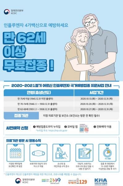 김형숙 건강관리과장은 “코로나19 장기화 상황에서 건강에 취약한 어린이, 임신부, 어르신의 경우 인플루엔자 유행시기 시작 전인 10~11월에는 접종을 완료하는 것이 좋다”며 “의료기관을 방문할 때는 마스크를 착용하고 손 세정제 사용, 체온 측정 등 방역수칙을 철저히 지켜주시기 바란다“고 말했다.