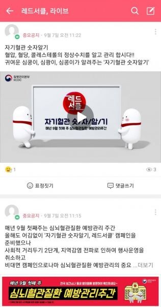 ‘레드서클, 라이브’ 밴드는 생활속 심뇌혈관질환 예방관리 9대 수칙 자기혈관 숫자알기 등 다양한 게시물을 게재하고 비대면 라이브강의를 통해 심뇌혈관질환예방관리의 중요성과 정보를 전달하고 있다.