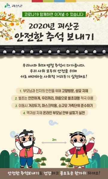 [무한뉴스] 충북 괴산군이 민족 최대 명절인 추석을 앞두고 신종 코로나바이러스 감염증(코로나19) 차단을 위해 ‘2020 안전한 추석보내기 4대 수칙(이하 4대 수칙)’을 10일 발표했다.