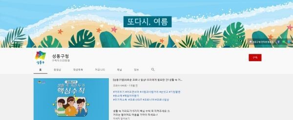지난 2018년 11월, 구청 인터넷방송국에서 시작한 ‘성동구청’ 유튜브 채널은 ‘윤피디, 양아나가 간다’, ‘Enjoy 성동’ 등 구정소식을 재미있고 흥미로운 영상으로 제작해 업로드 하며 주민들의 관심을 끌고 있다.