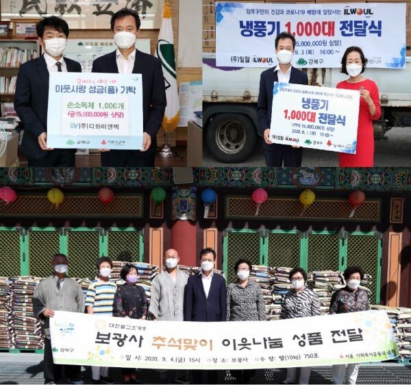 이 외에도 전문건설공제조합을 비롯해 30개 단체 및 주민들이 6,900만여원의 성금과 1억 6천만원 상당의 성품을 모아 강북구에 기증했다.