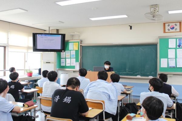 같은 날 오후에는 청주 상당경찰서 학교 전담 경찰관을 초청해 ‘N번방과 사이버 폭력’을 주제로 현장과 온라인에서 동시에 블렌디드 형태의 사이버폭력 예방 교육도 진행했다.