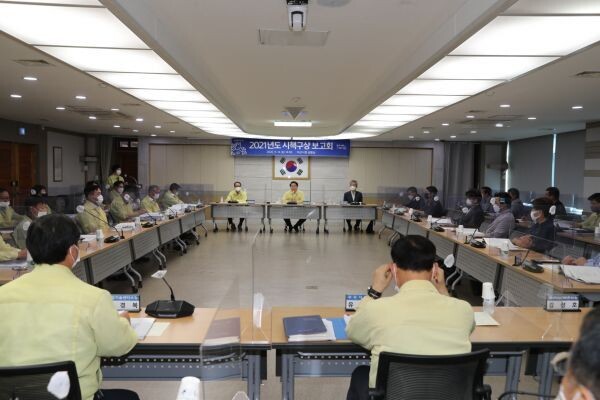 국·소장 및 주무과장 등 공무원과 정책특별보좌관, 더 큰 시정위원회 분과위원장 등 외부 인사들이 참석한 가운데 상황실에서 열린 이번 보고회는 코로나19 감염예방을 위해 참여 인원을 최소화하고 마스크 착용과 가림막 설치 등 방역수칙을 준수하며 진행됐다.